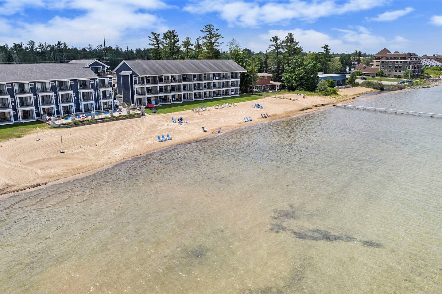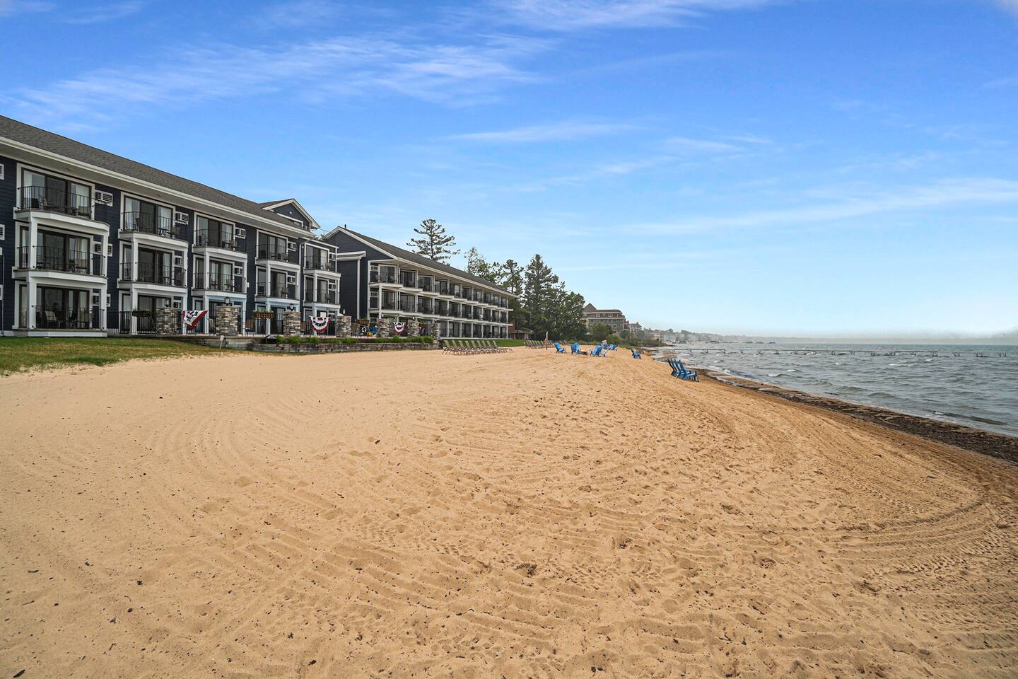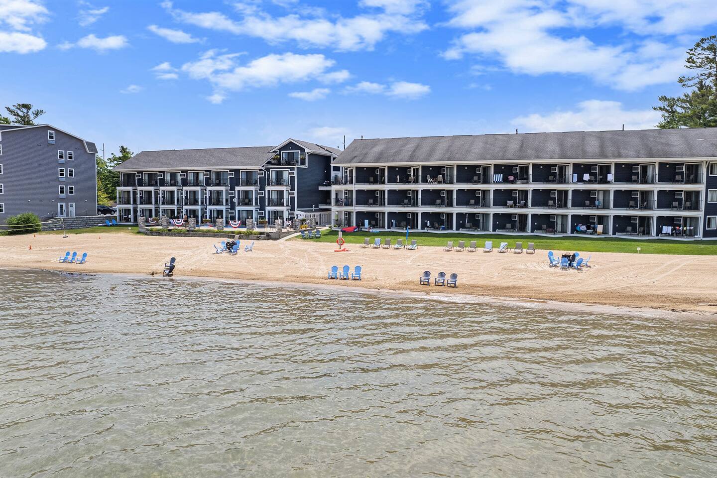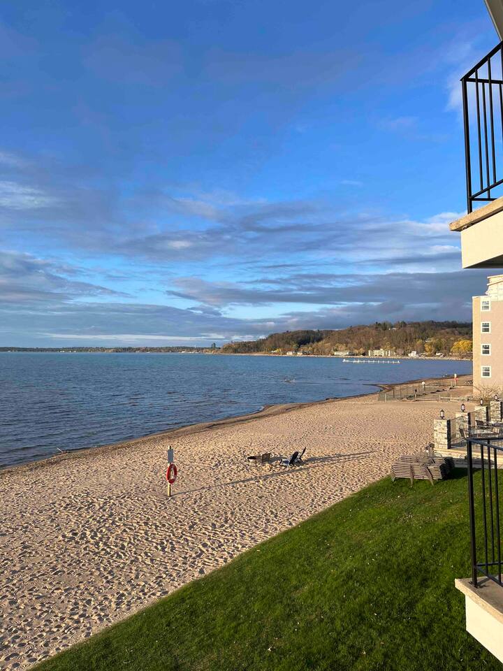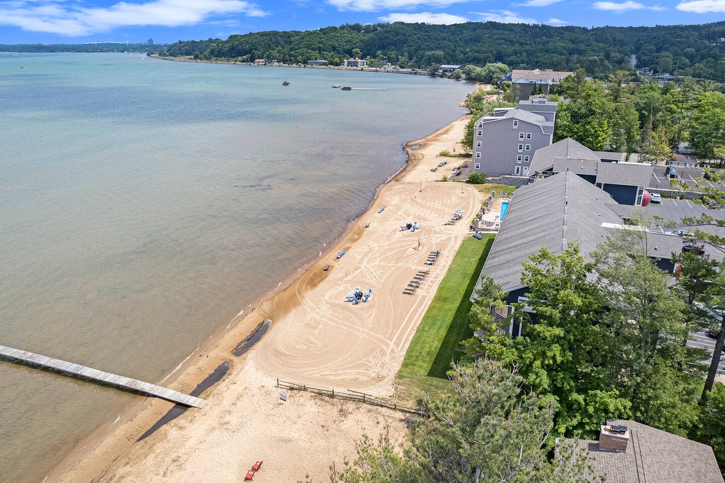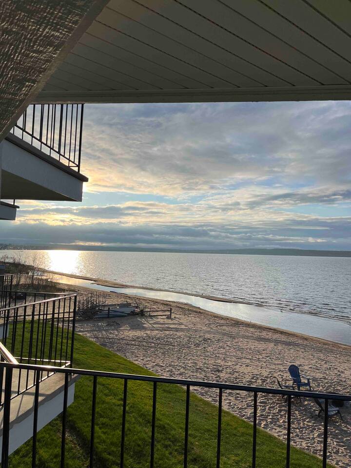 Enjoy this newly renovated studio condo, directly on East Bay with a heated pool! This condo was renovated in 2023 and not a detail was left out, making this a comfortable, yet stylish space while visiting Traverse City. Hang out on the patio while enjoying the water views. Play on the large sandy beach. Enjoy the waterfront, complex pool right out the door! The studio sleeps 4, with a King size bed and a queen size sleeper sofa. A tiled walk in shower and kitchenette complete the space.