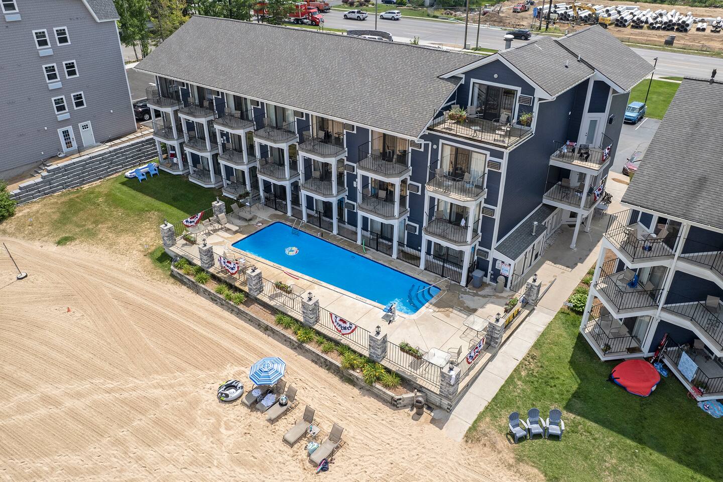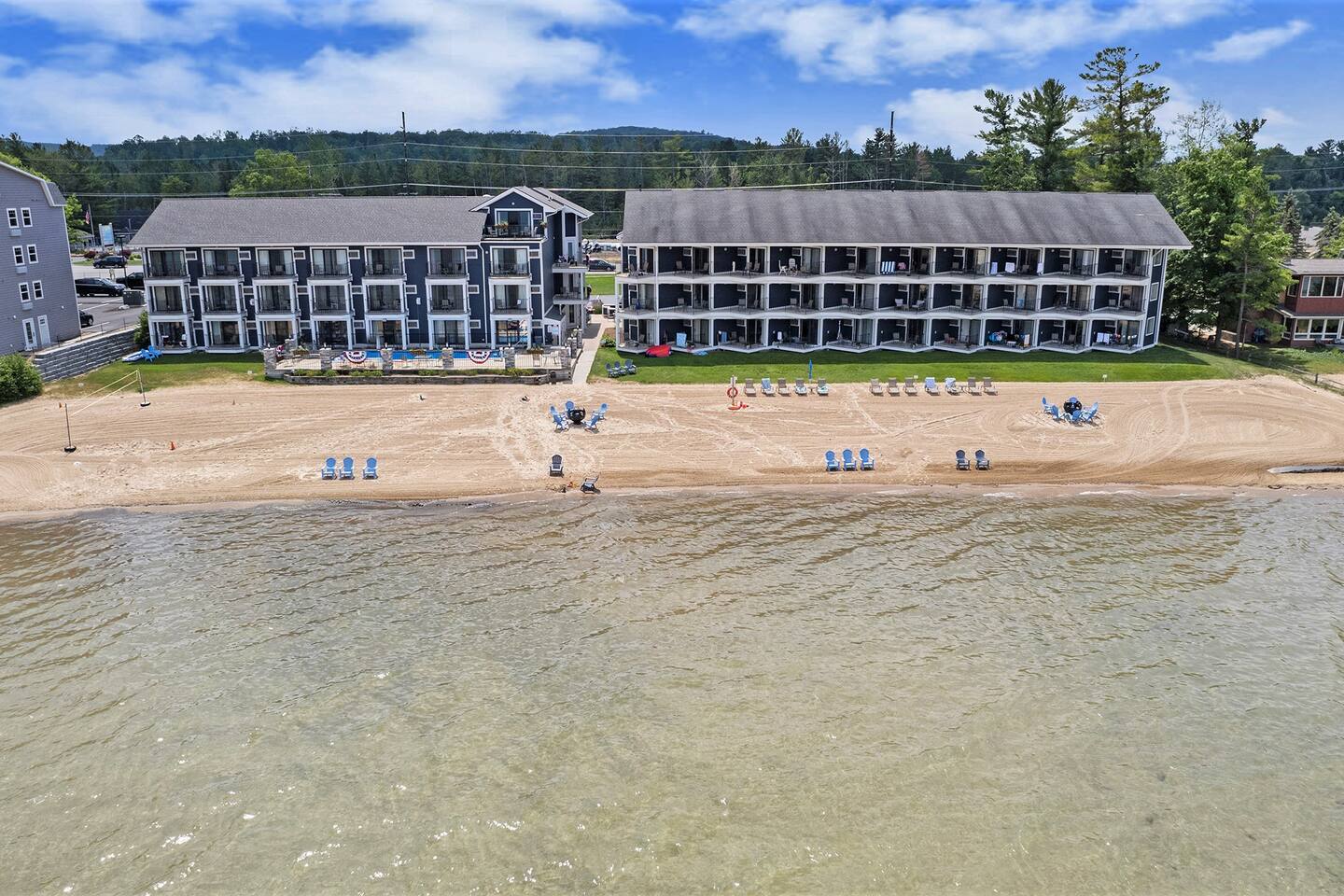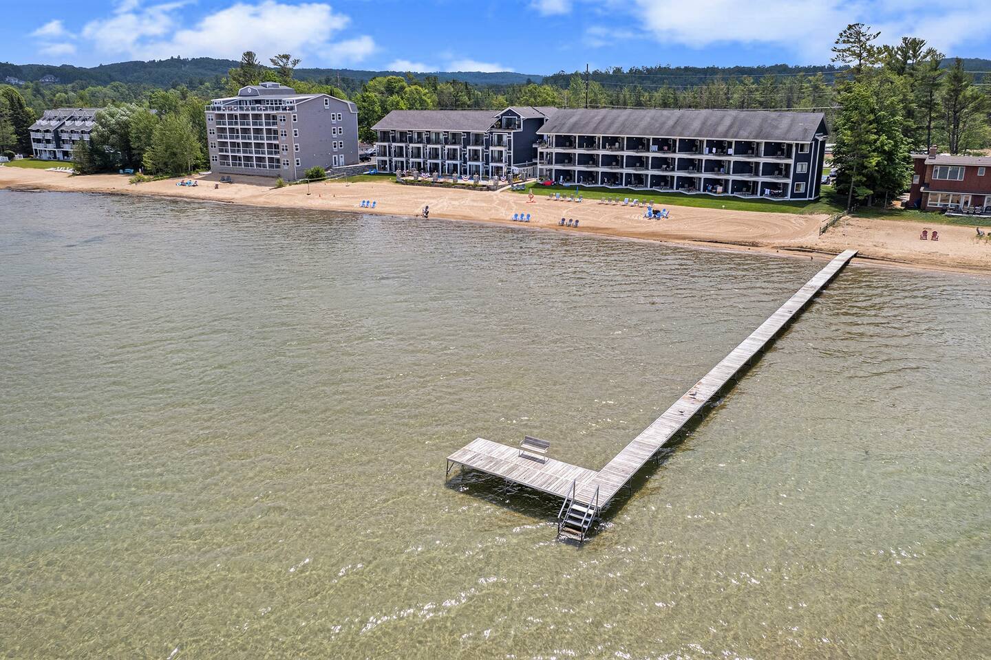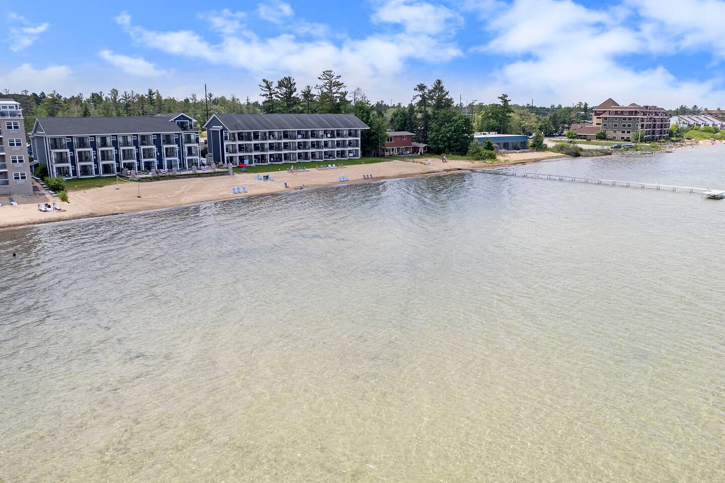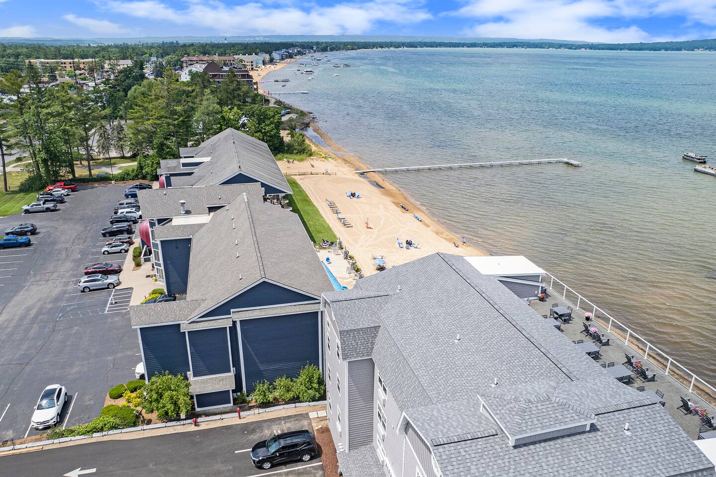 Enjoy this newly renovated studio condo, directly on East Bay with a heated pool! This condo was renovated in 2023 and not a detail was left out, making this a comfortable, yet stylish space while visiting Traverse City. Hang out on the patio while enjoying the water views. Play on the large sandy beach. Enjoy the waterfront, complex pool right out the door! The studio sleeps 4, with a King size bed and a queen size sleeper sofa. A tiled walk in shower and kitchenette complete the space.