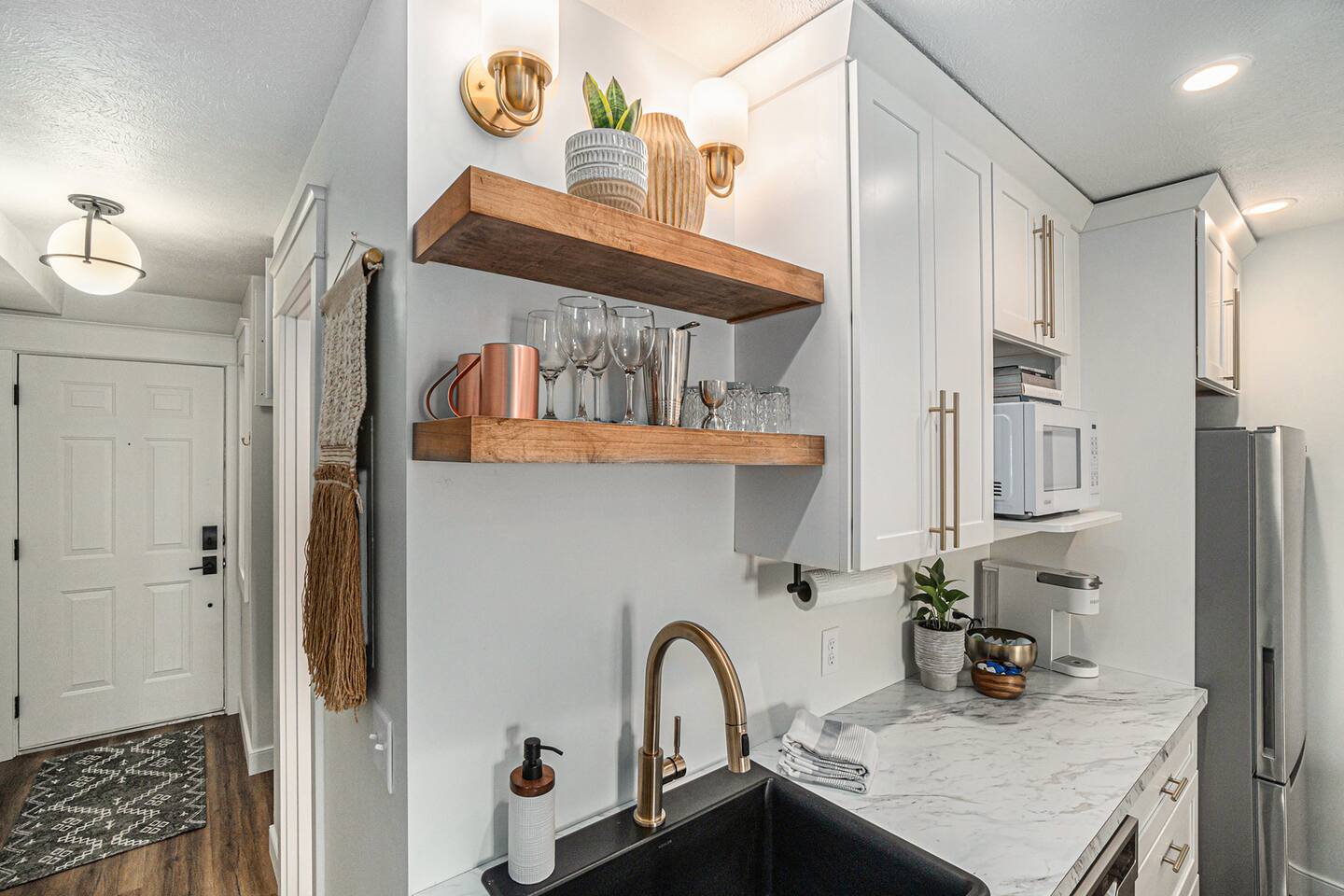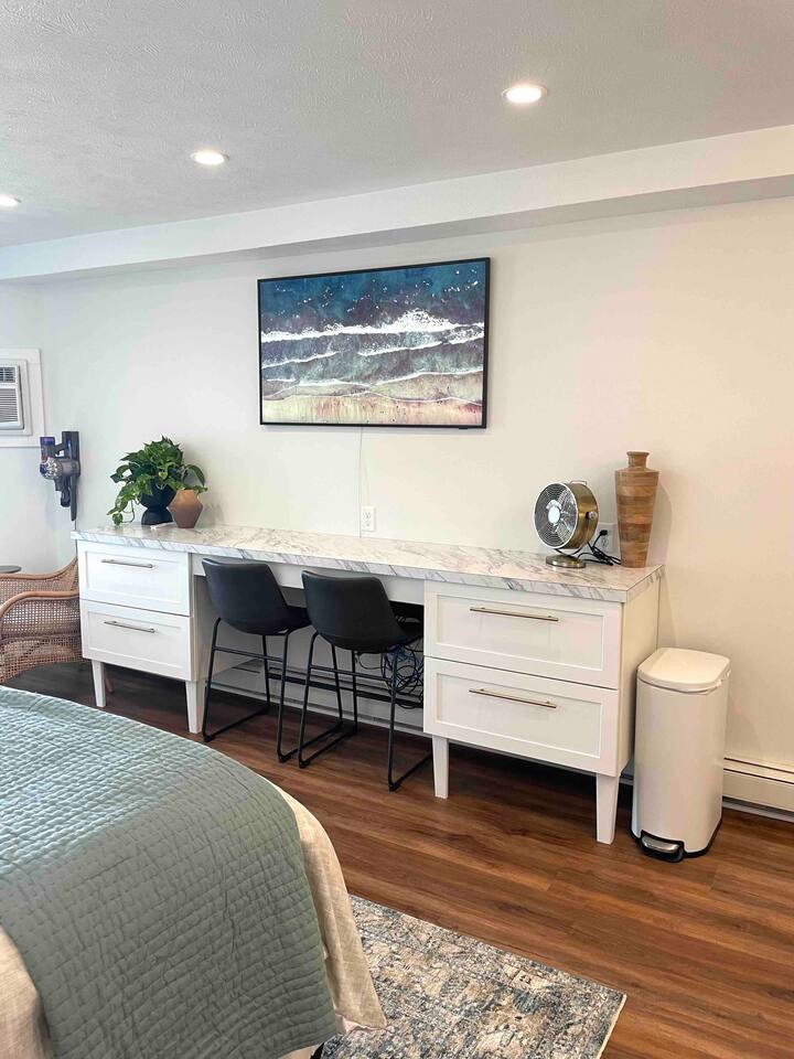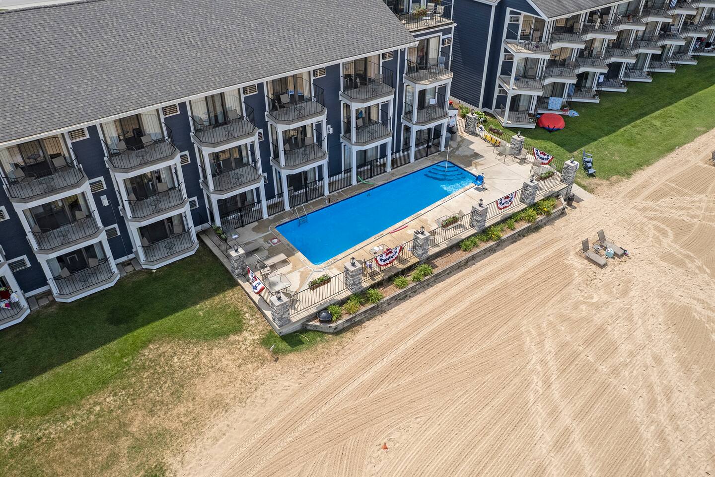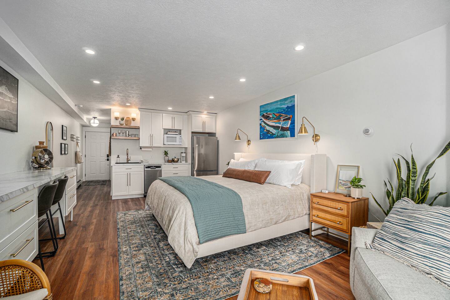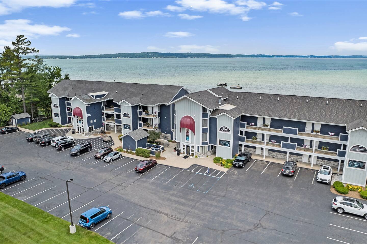 Enjoy this newly renovated studio condo, directly on East Bay with a heated pool! This condo was renovated in 2023 and not a detail was left out, making this a comfortable, yet stylish space while visiting Traverse City. Hang out on the patio while enjoying the water views. Play on the large sandy beach. Enjoy the waterfront, complex pool right out the door! The studio sleeps 4, with a King size bed and a queen size sleeper sofa. A tiled walk in shower and kitchenette complete the space.